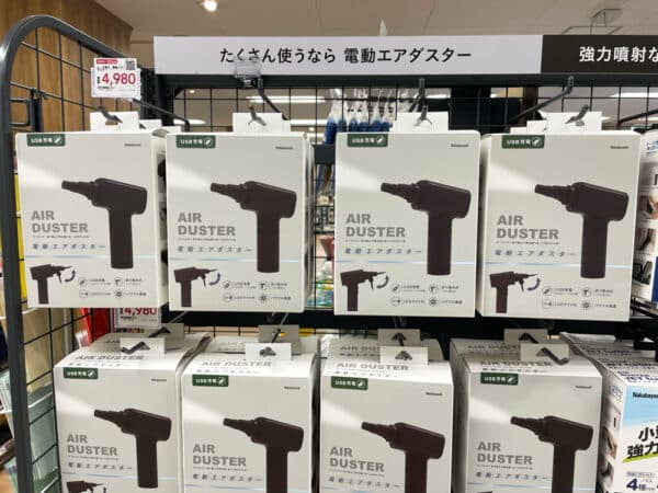 カインズホームでは、先ほどご紹介させていただいたナカバヤシの電動エアダスターが販売されていました。価格はこちらも4,980円。残念ながら実機がなくテストできませんでした。こちらはスペック的にはパソコン周りや車内など比較的大きな風量が必要ないところがおすすめです。