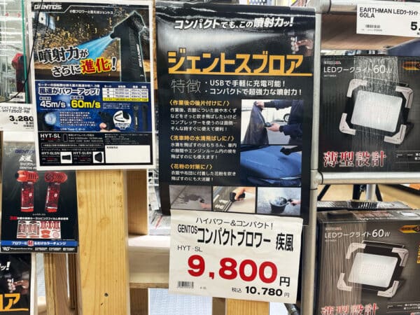 ホームセンターのデパート「ジョイフル本田」では、最新のGENTOS HYT-SLを発見!当ブログでも実機調査済みのおすすめブロワーです。ただ、Amazonや楽天よりも数千円高いのが難点です。